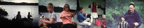 Kesälän Tauno, Anja ja Paavo kalassa 1960-luvulla Stortträskillä Kirkkonummella. Viimeisessä kuvassa Taunon kalansaalis Lapissa.
