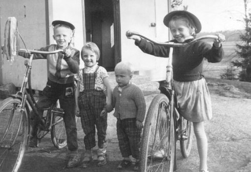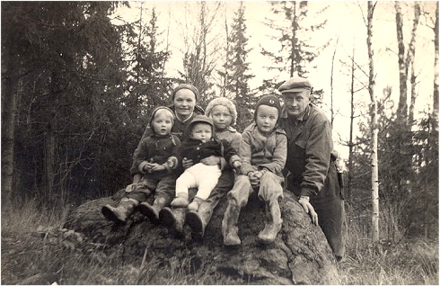 Kesälän perhe Evitskogissa syksyn perunannoston lomassa vuonna 1957. Takana: Eeva (os.Yrttiaho) ja Tauno Kesälä. Edessä lapset: Anja, Paavo, Paula ja Pekka.