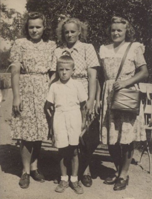 Martta, Tyyne ja Eeva Yrttiaho sekä Tyynen poika Kalevi. Pitäjänmäki, Helsinki 1948.